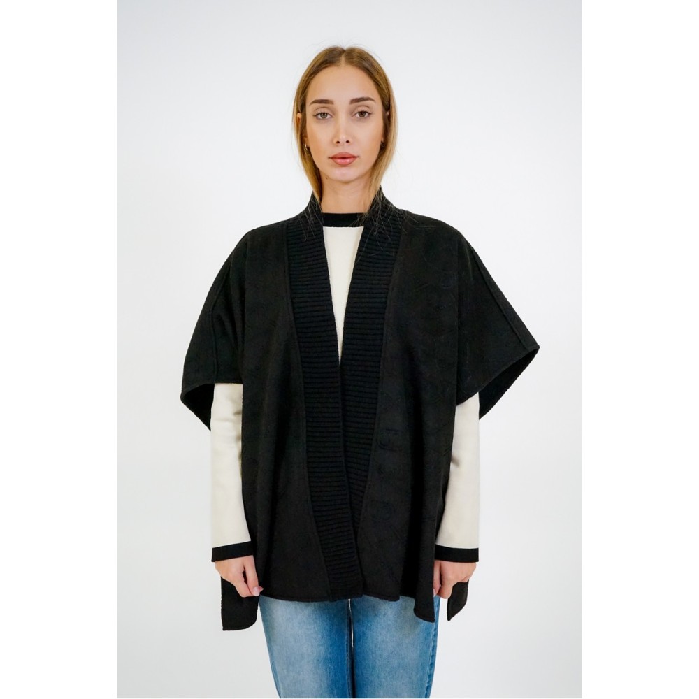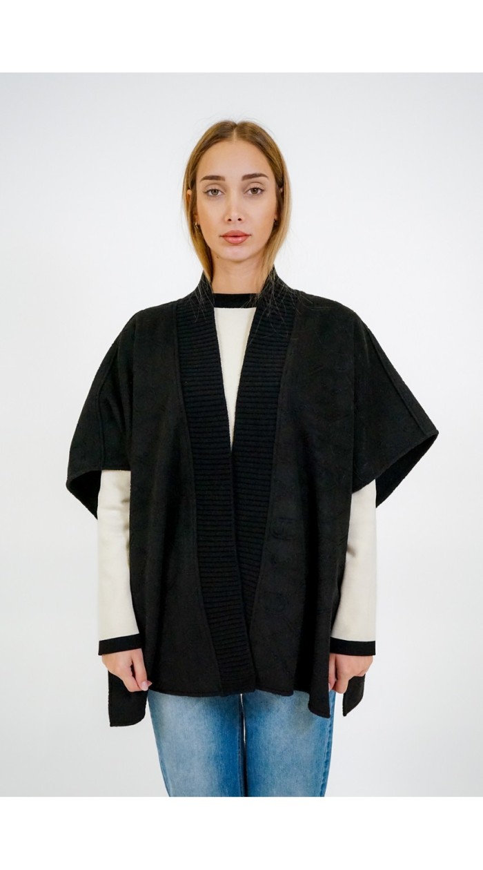 Cloth poncho with embossed Oval T logo all over. It has a ribbed knit opening and buttons with Oval T on the sides.