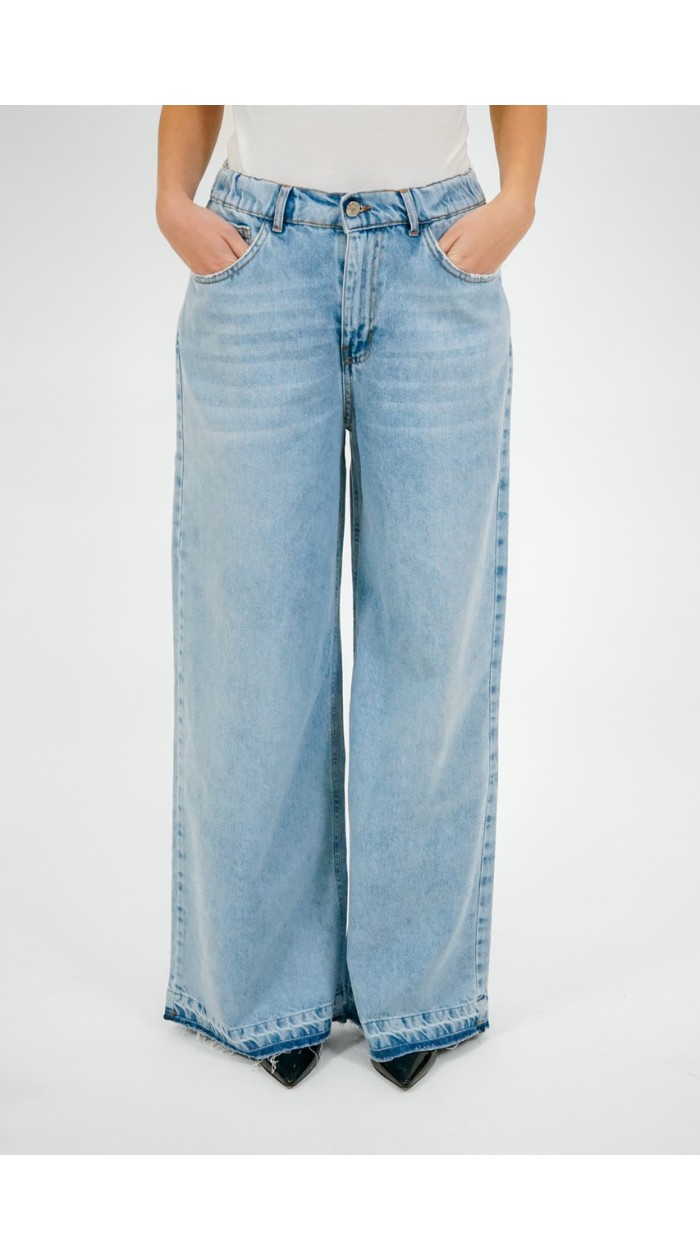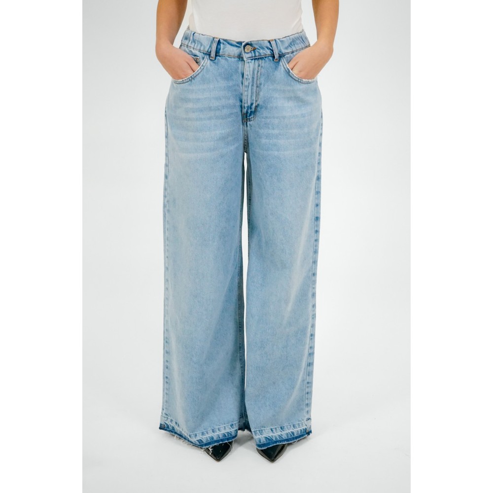 Women's wide leg jeans, high waist, with elastic waistband, zip and button closure.
