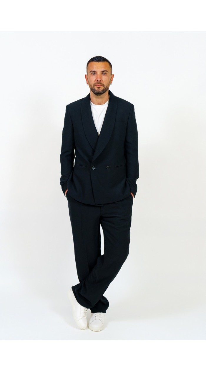 Solid-color men's double-breasted suit. Jacket: double-breasted jacket, regular fit, flush pockets, rounded lapels. Pants: palazzo pants, zip and button closure, regular fit. The model is wearing size 50.