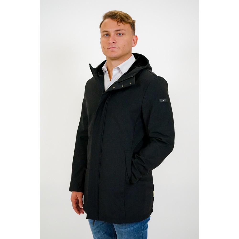 Long men's jacket with hood, fur lining, solid color, slim fit. The model is wearing size L.