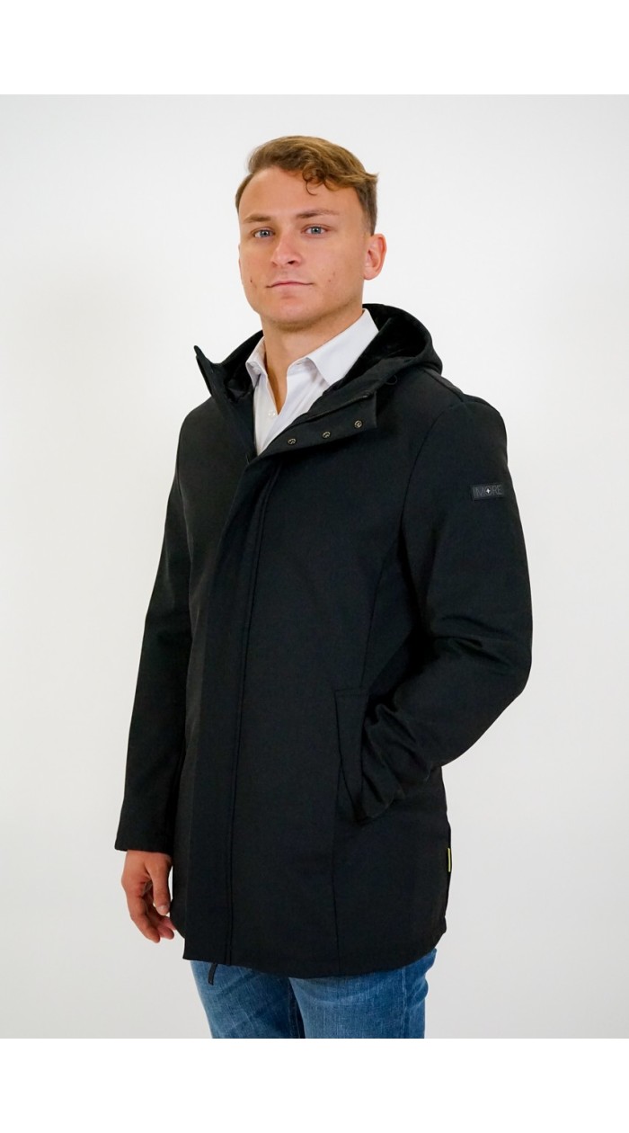 More men's short hooded jacket, solid color, zip closure, welt pockets, slim fit. The model is wearing size L.