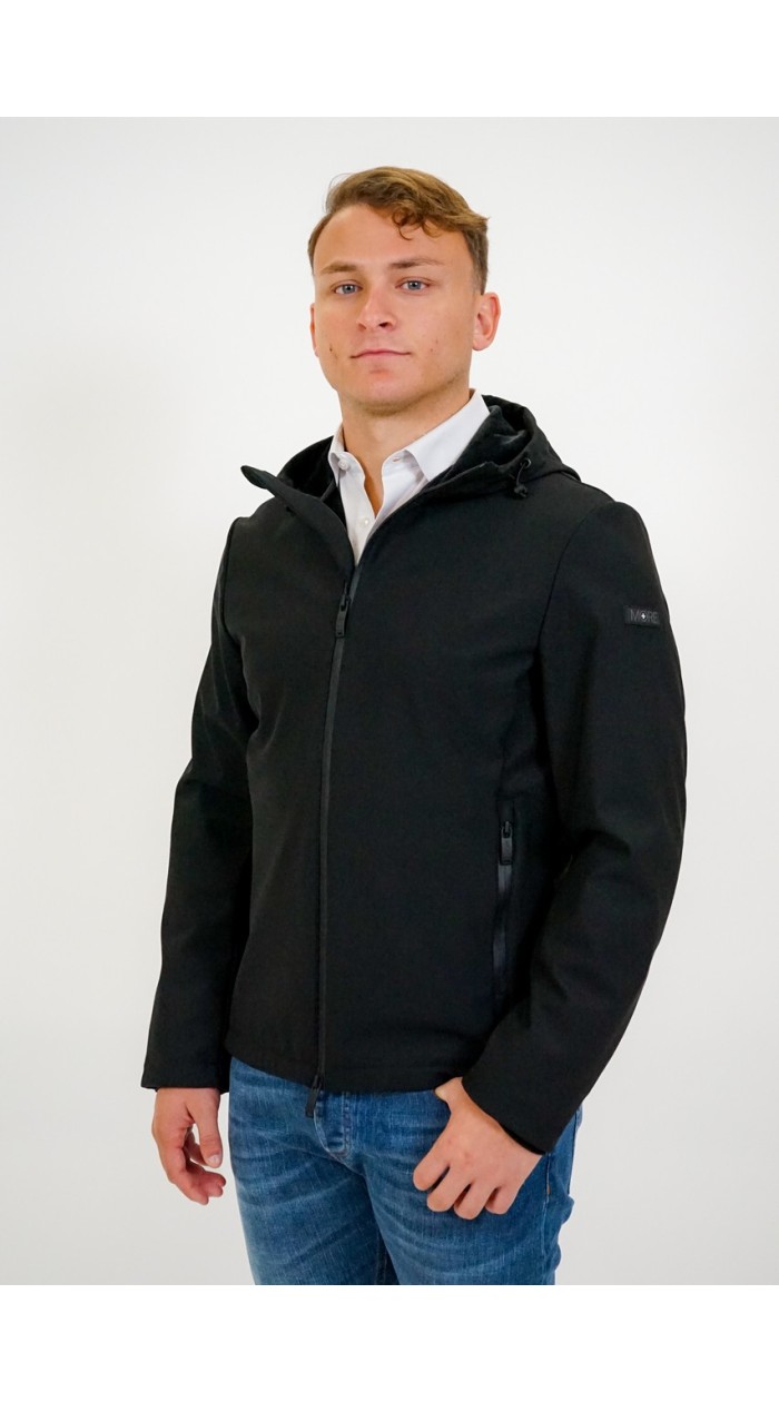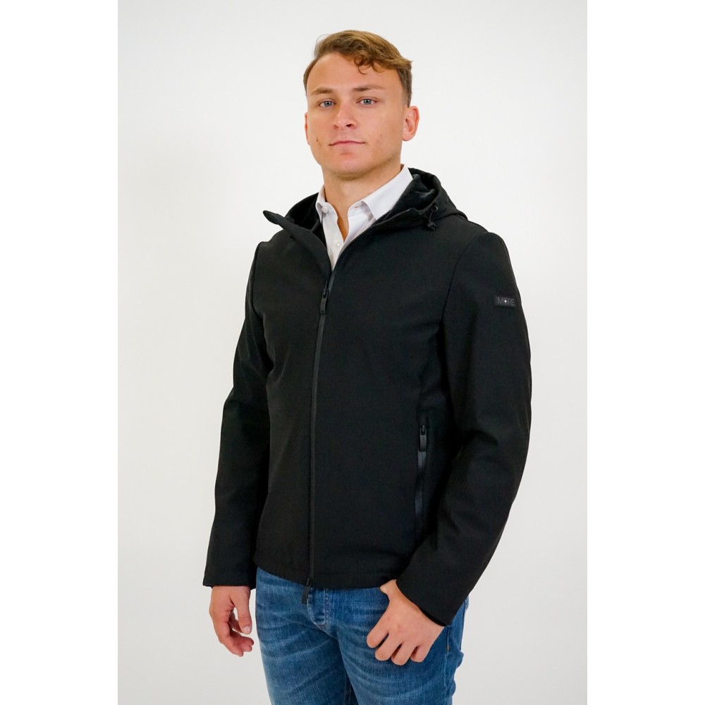 More men's short hooded jacket, solid color, zip closure, welt pockets, slim fit. The model is wearing size L.