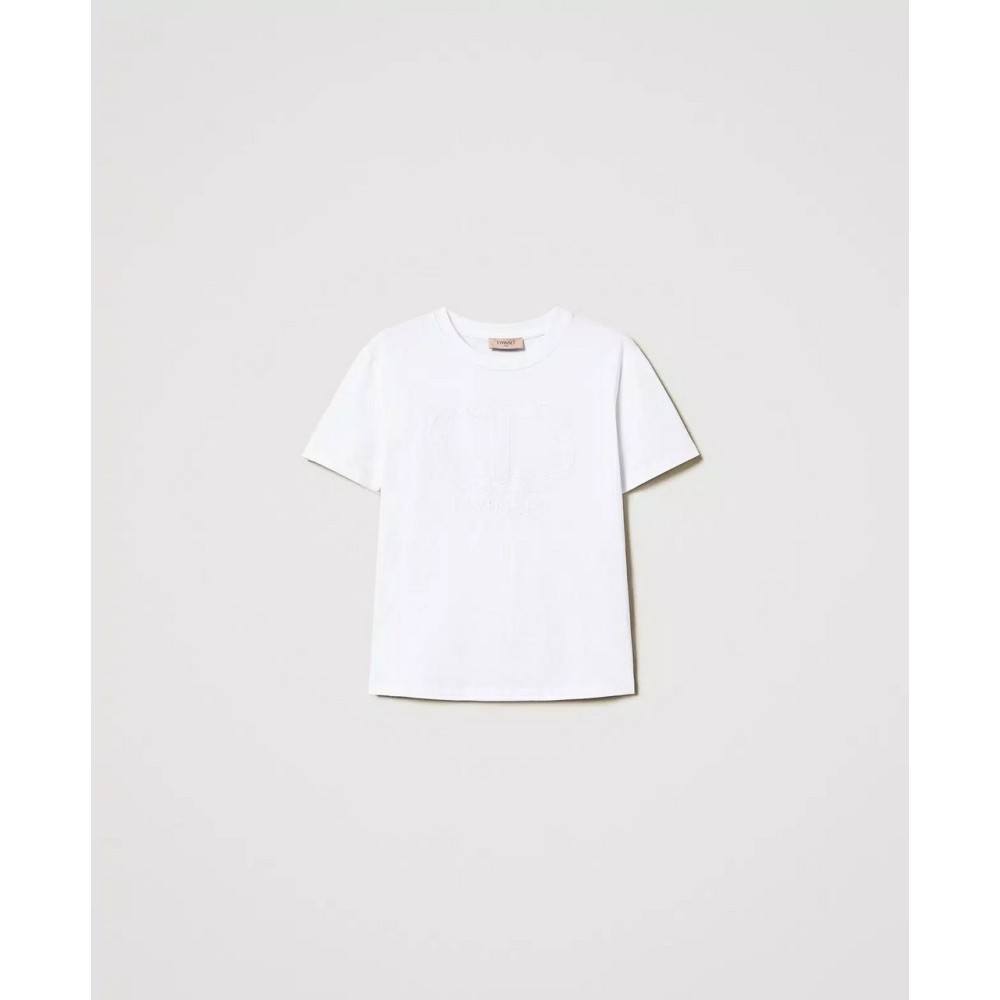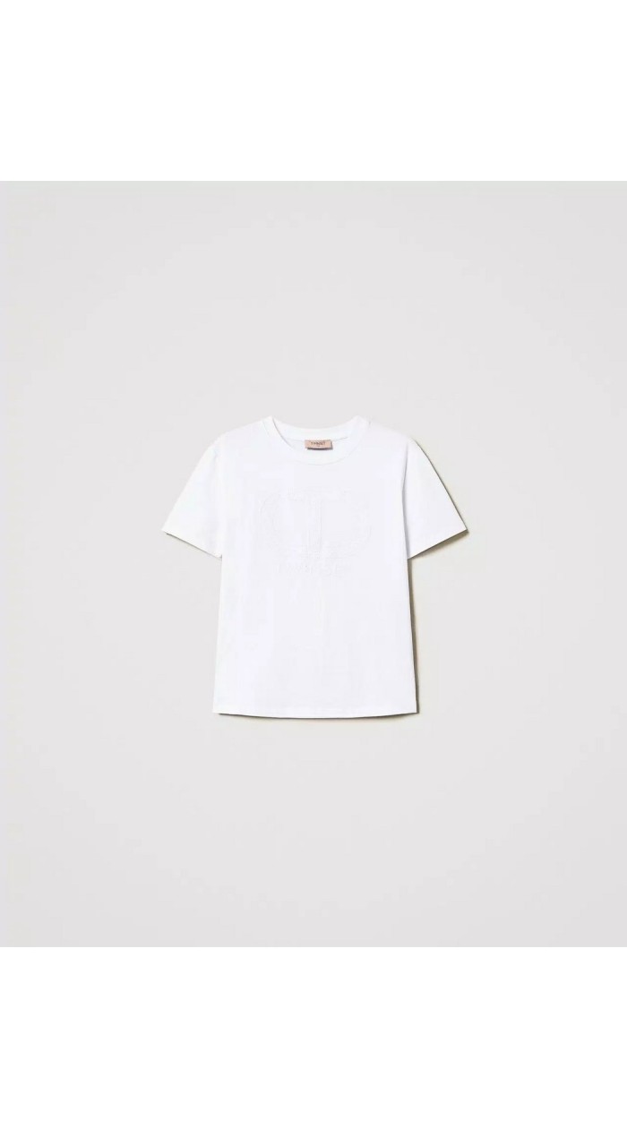 Cotton jersey T-shirt with matching thread embroidery with floral Oval T graphic exclusively for Twinset. It has a round neck, short sleeves, regular fit.