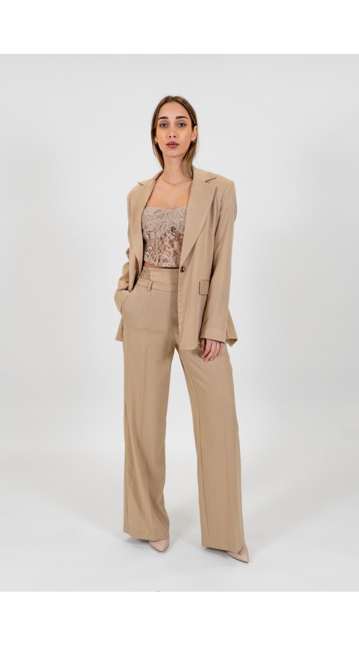 Dixie solid-color women's suit, featuring a slim-fit single-breasted jacket. Solid-color palazzo pants with a zip and button closure. The model is wearing size XS.