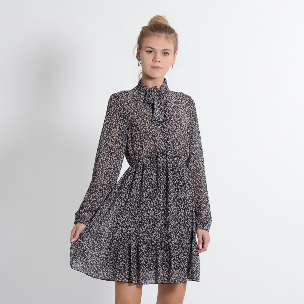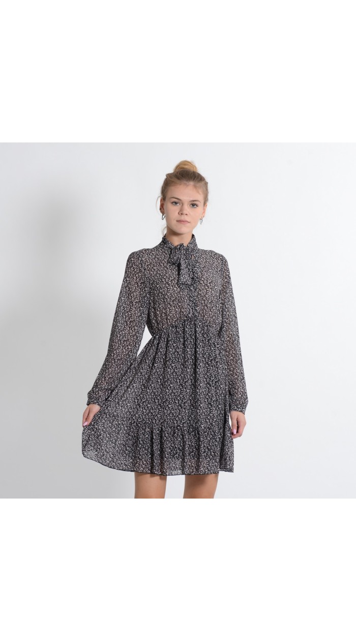 Kontatto women's short dress with ruffle. Long sleeve, Korean collar with bow.