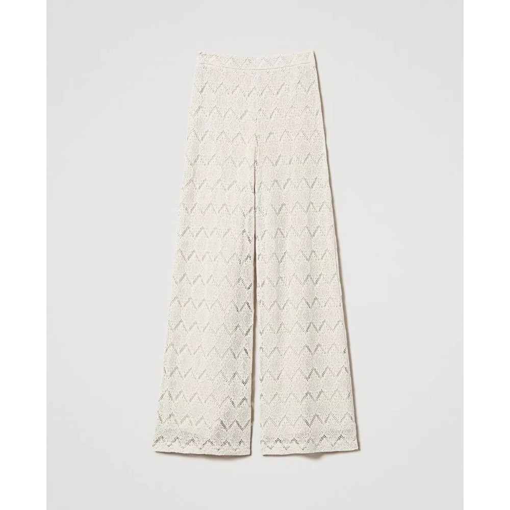 Macramé lace pants with geometric design, high waist, zipper closure at hip, Oval T logo plaque on back, cotton muslin lining, wide leg line.