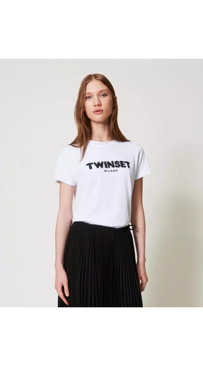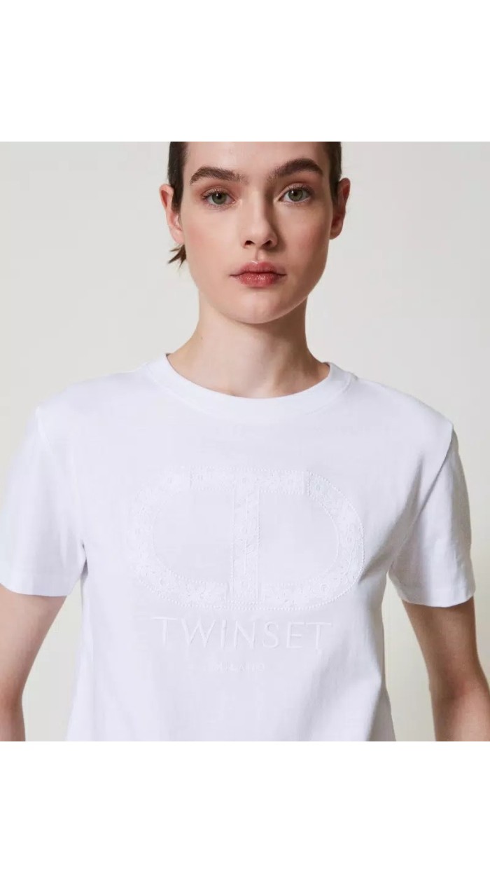 Cotton jersey T-shirt with matching thread embroidery with floral Oval T graphic exclusively for Twinset. It has a round neck, short sleeves, regular fit.