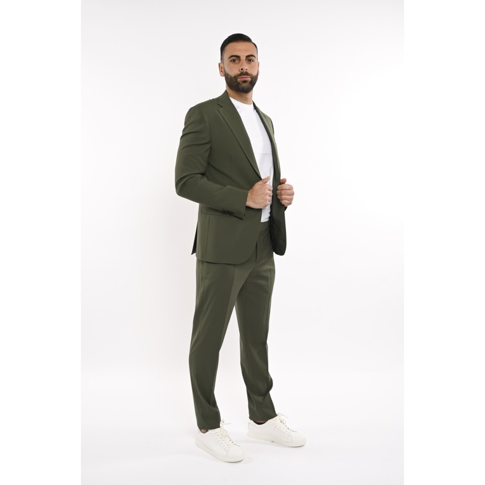 Solid-coloured men's suit Barbati. Jacket: Single breasted, two buttons, patch pocket, slim fit. Trousers: Pant model with darts, zip and button fly. The model wears size 48.