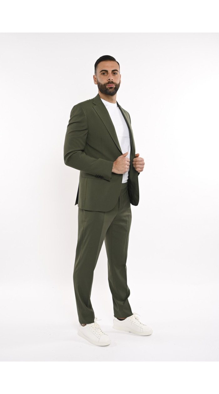 Men's plain stitched suit. Jacket: single breasted jacket, solid colour, front pockets, regular fit. Trousers: trousers with darts, America pocket, regular fit, clip and zip fastening.