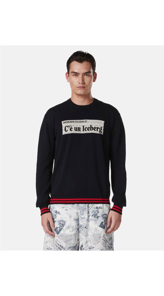 White crew-neck shaved dropped sweater made of 100 percent cotton for natural, breathable comfort. Newspaper graphic in double jacquard gives a unique and contemporary character, perfect for those seeking a sophisticated style.
