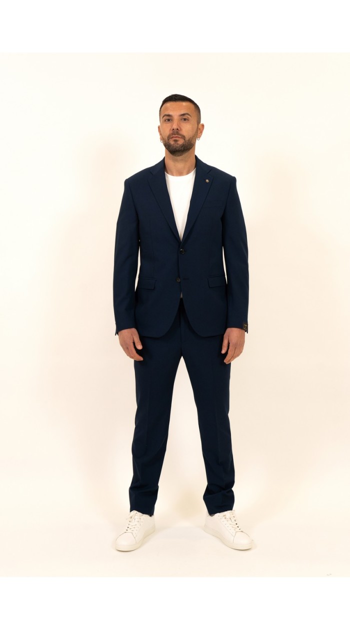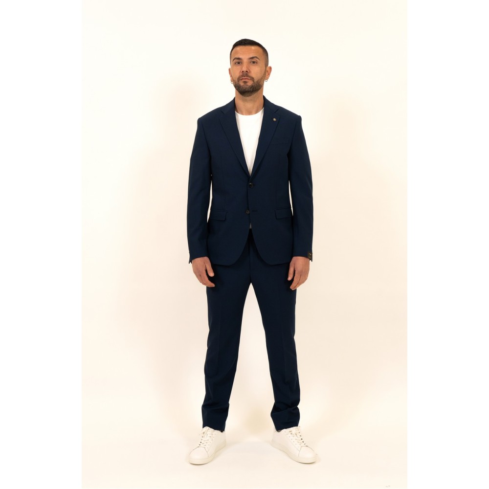 Manuel Ritz solid colour men's suit. Jacket: single breasted jacket, solid colour, spread collar, flap pocket. Trousers: American pocket trousers, clip and button fly, regular fit. The model wears size 50.