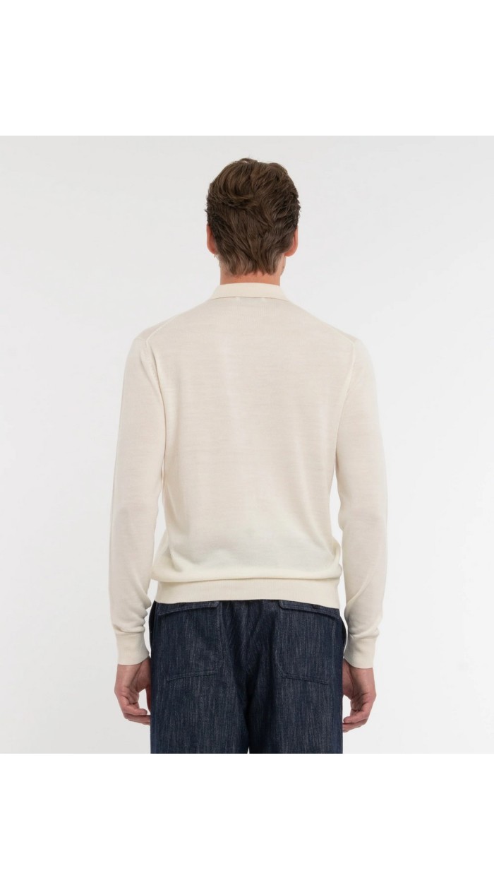 Long-sleeved polo shirt, three-button closure, tone-on-tone logo embroidery, ribbed trim. Pure merino wool.