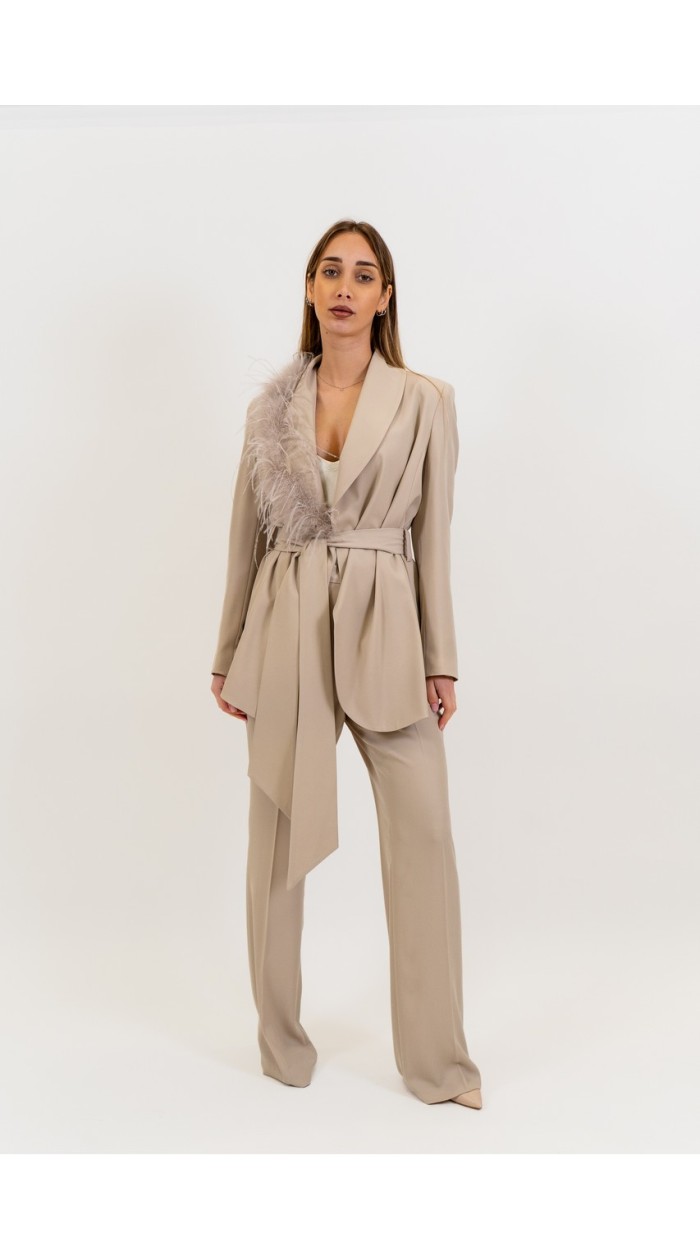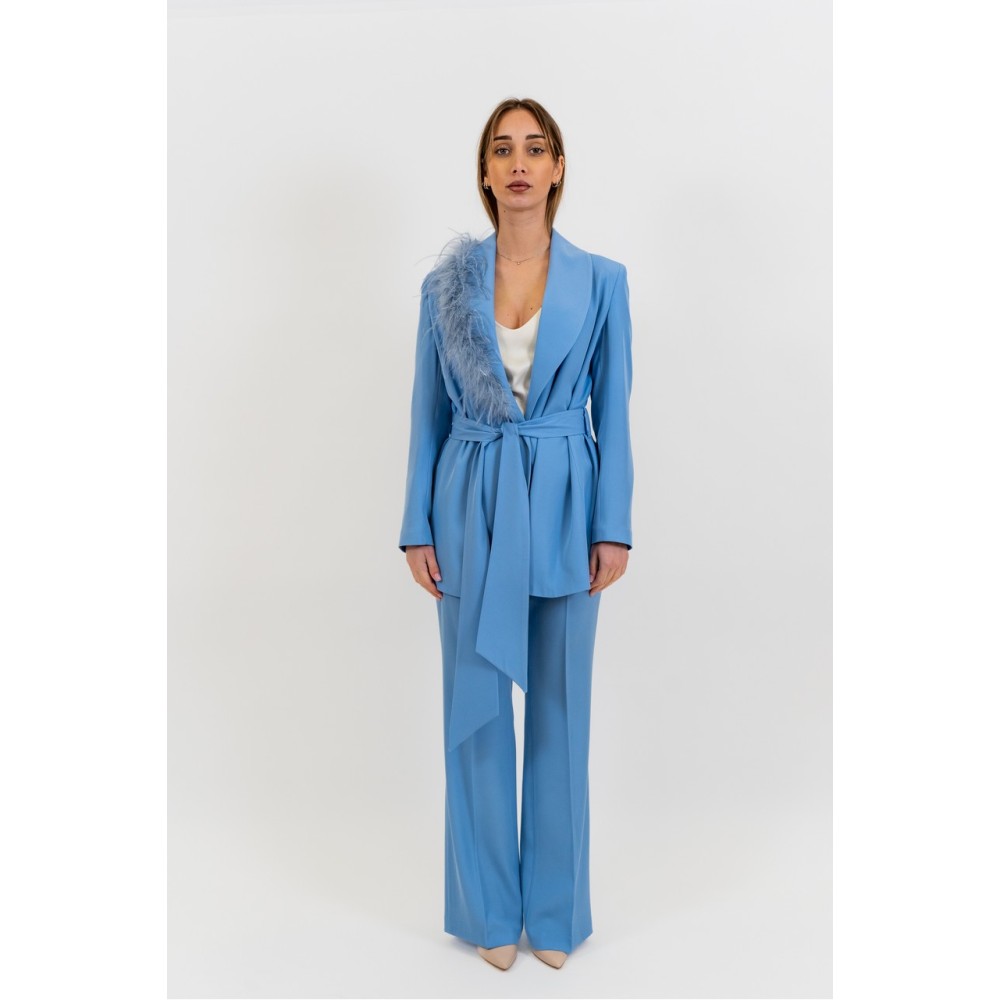 Elena Casali women's suit, sash at the waist, feather details on the lapels, regular fit. Pants: Flared pants, solid color, side zipper closure. The model is wearing size 40.