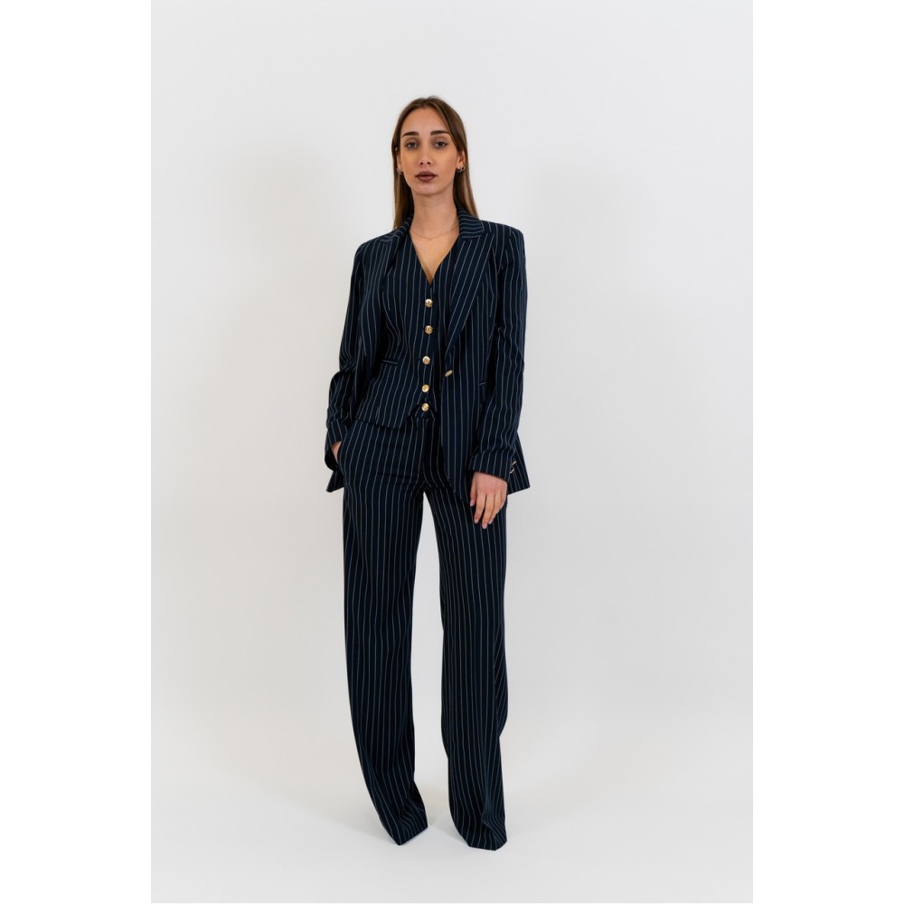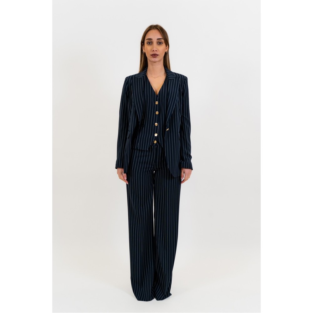 Elena Casali women's 3-piece pinstriped suit. Jacket: slim single-breasted style, contrasting gold buttons, protruding shoulder pads. Waistcoat: slim style, contrasting gold buttons. Trousers: flared style, high waist, zip and button closure.
