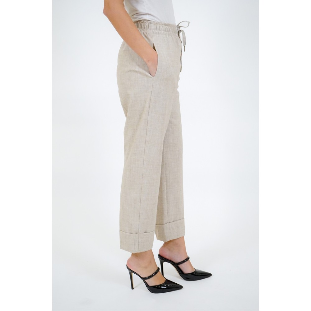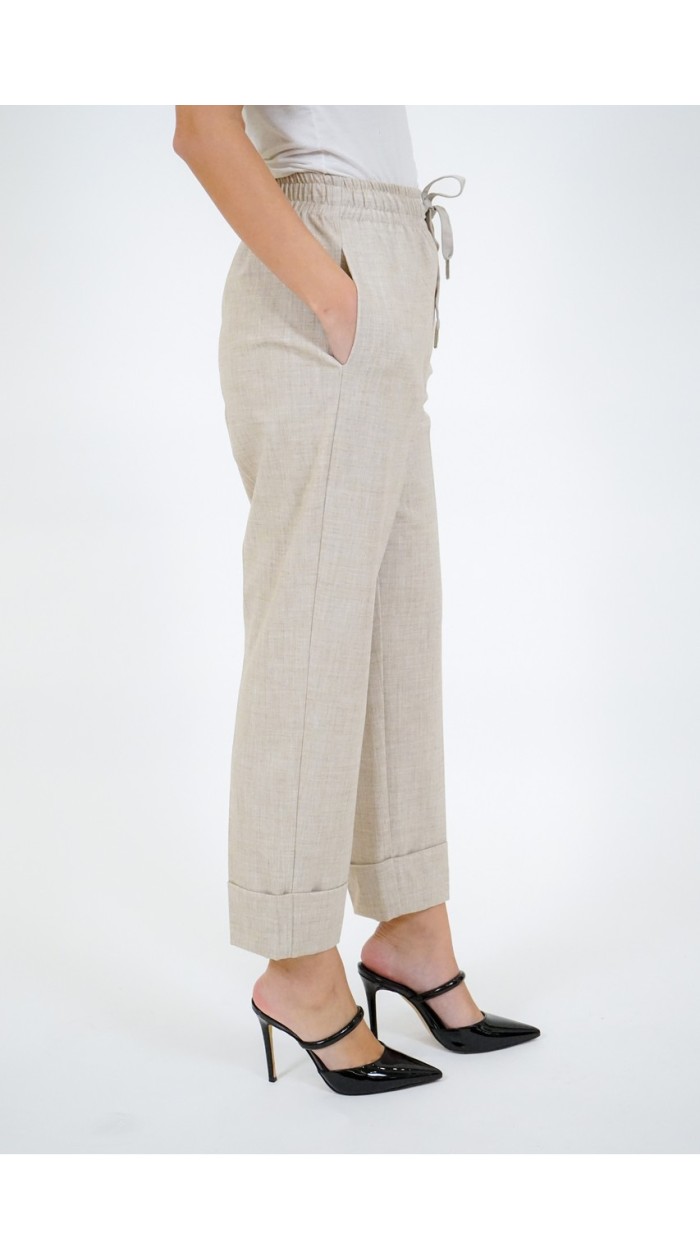 Women's cigarette pants, elastic waistband with drawstring, pleats at the bottom.