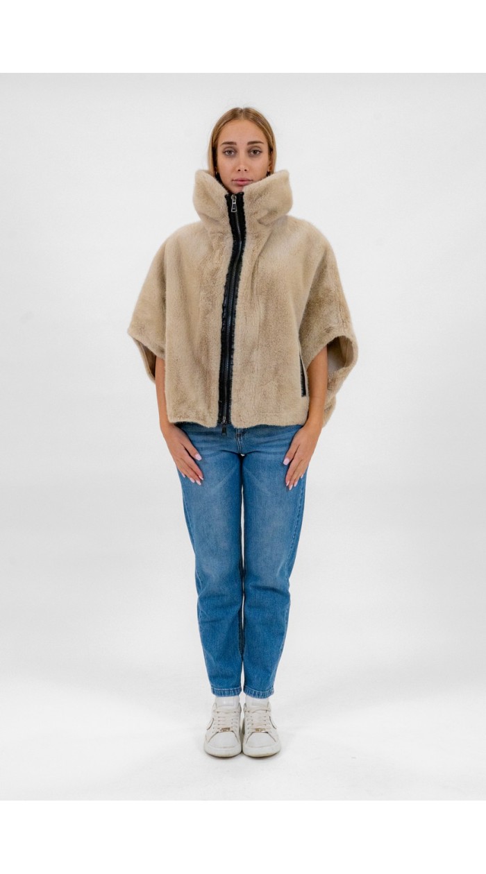 Women's cape-style fur coat with contrasting zip closure. Leather details on the zip and pockets.
