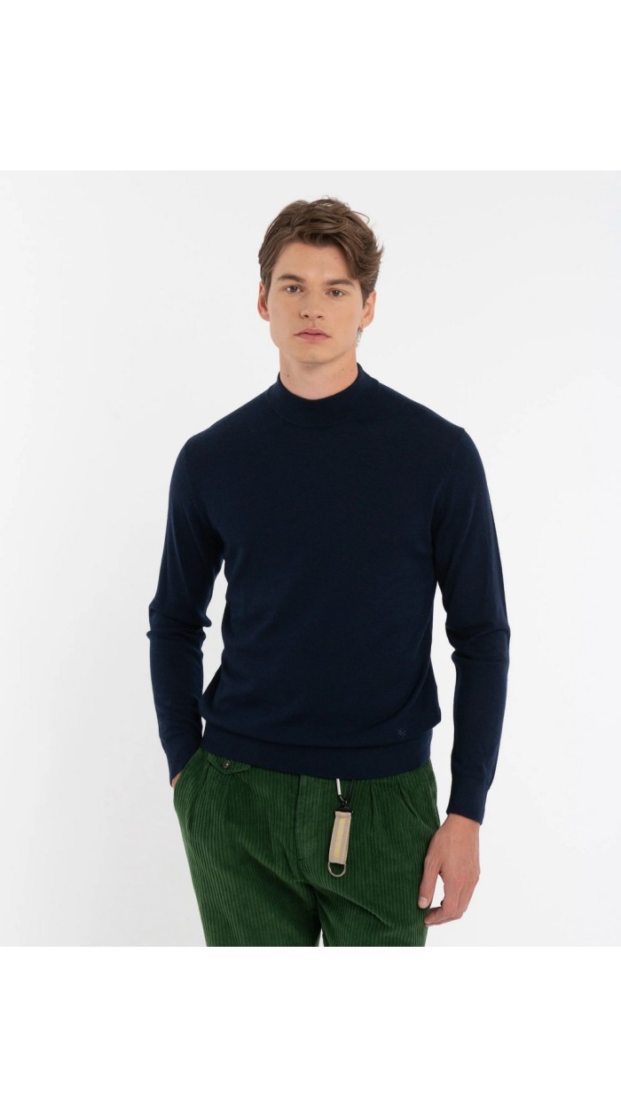 Mock neck with ribbed trim, tone-on-tone logo embroidery. Pure merino wool.