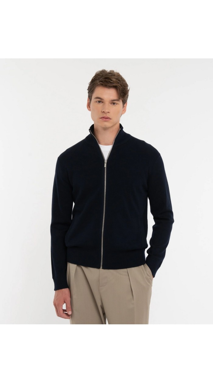 Cardigan with full zip closure, two front pockets, tone-on-tone logo embroidery, ribbed trim. Wool blend knit fabric