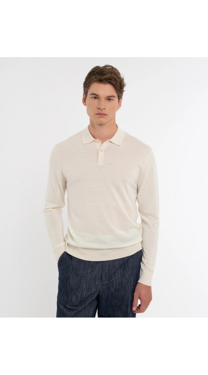 Long-sleeved polo shirt, three-button closure, tone-on-tone logo embroidery, ribbed trim. Pure merino wool.