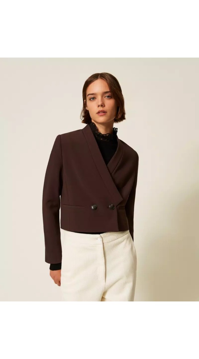 Short jacket in viscose blend double crepe with stand-up collar, double-breasted button closure, long sleeves, welt pockets, Oval T logo plaque on the back, straight cut.