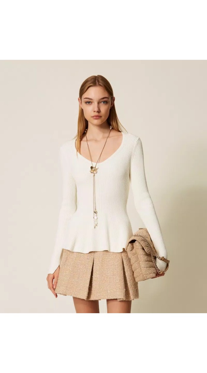 Viscose blend sweater with English ribbing, V-neck, long glove sleeves, flared hem, Oval T logo plaque on the back.