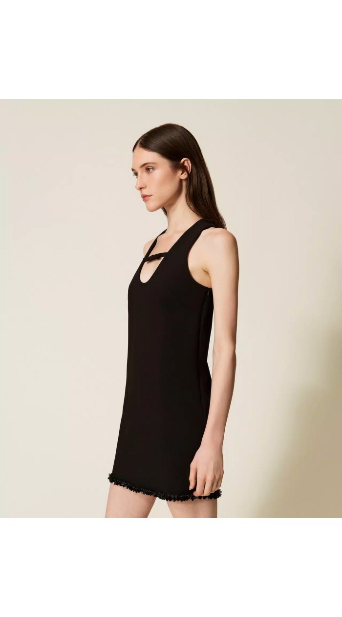 Short dress in viscose blend crepe with sequin trim at the hem. Sleeveless, with ribbon and bow neckline, invisible zip closure, lining, Oval T logo tag on the back, slim fit.