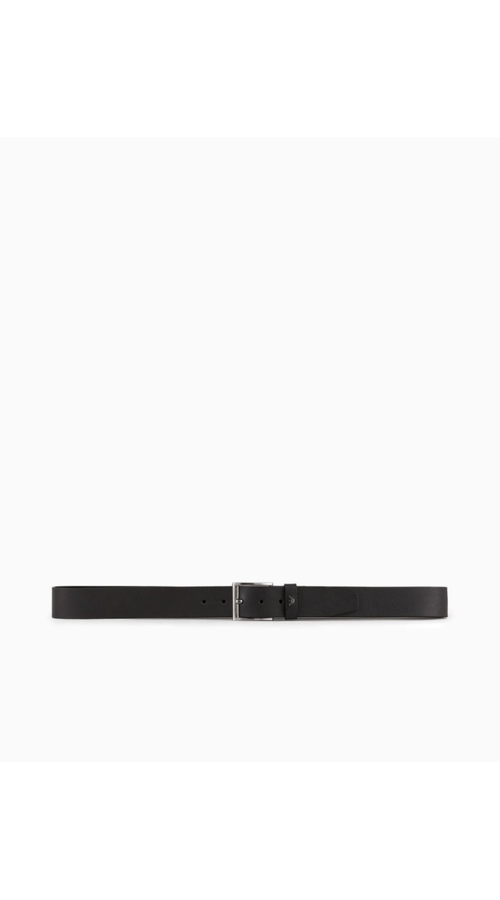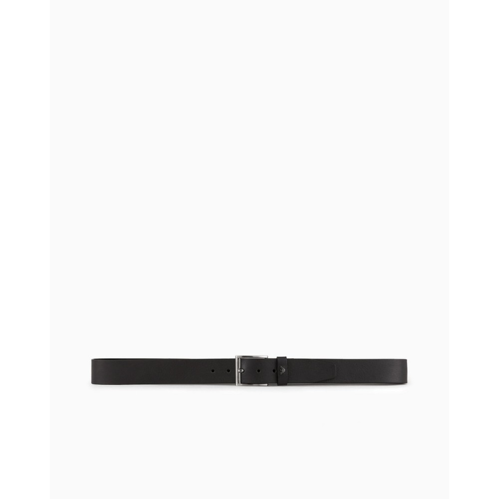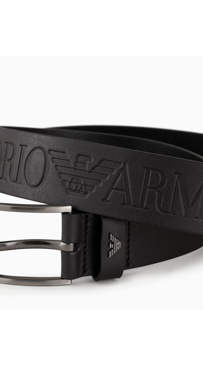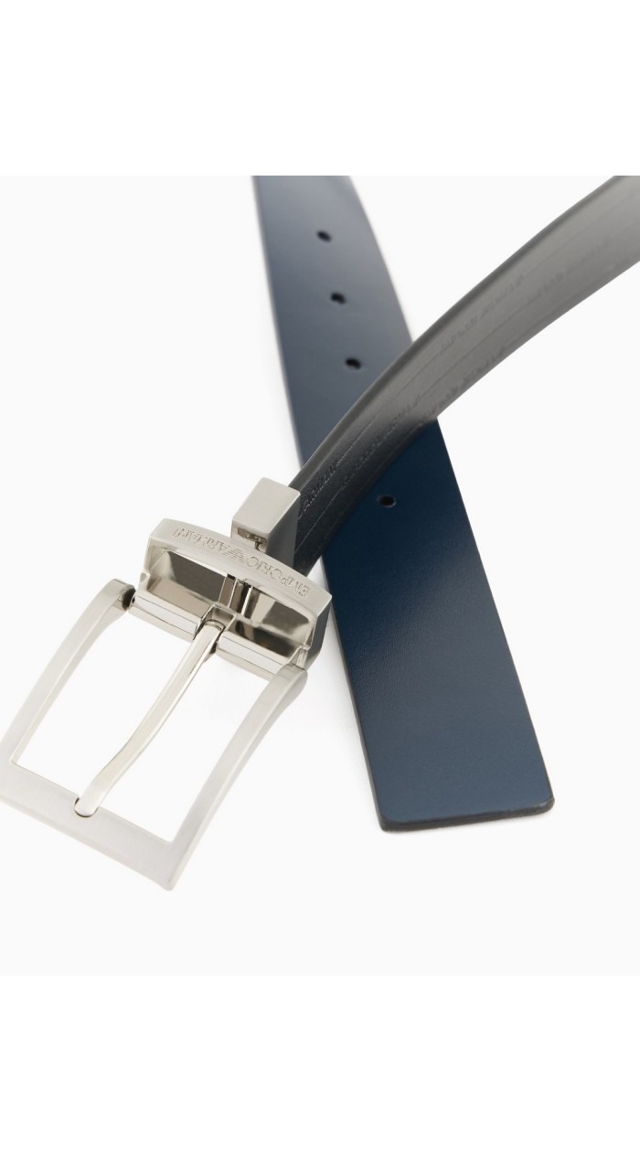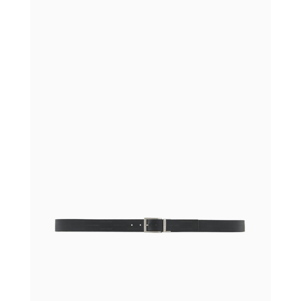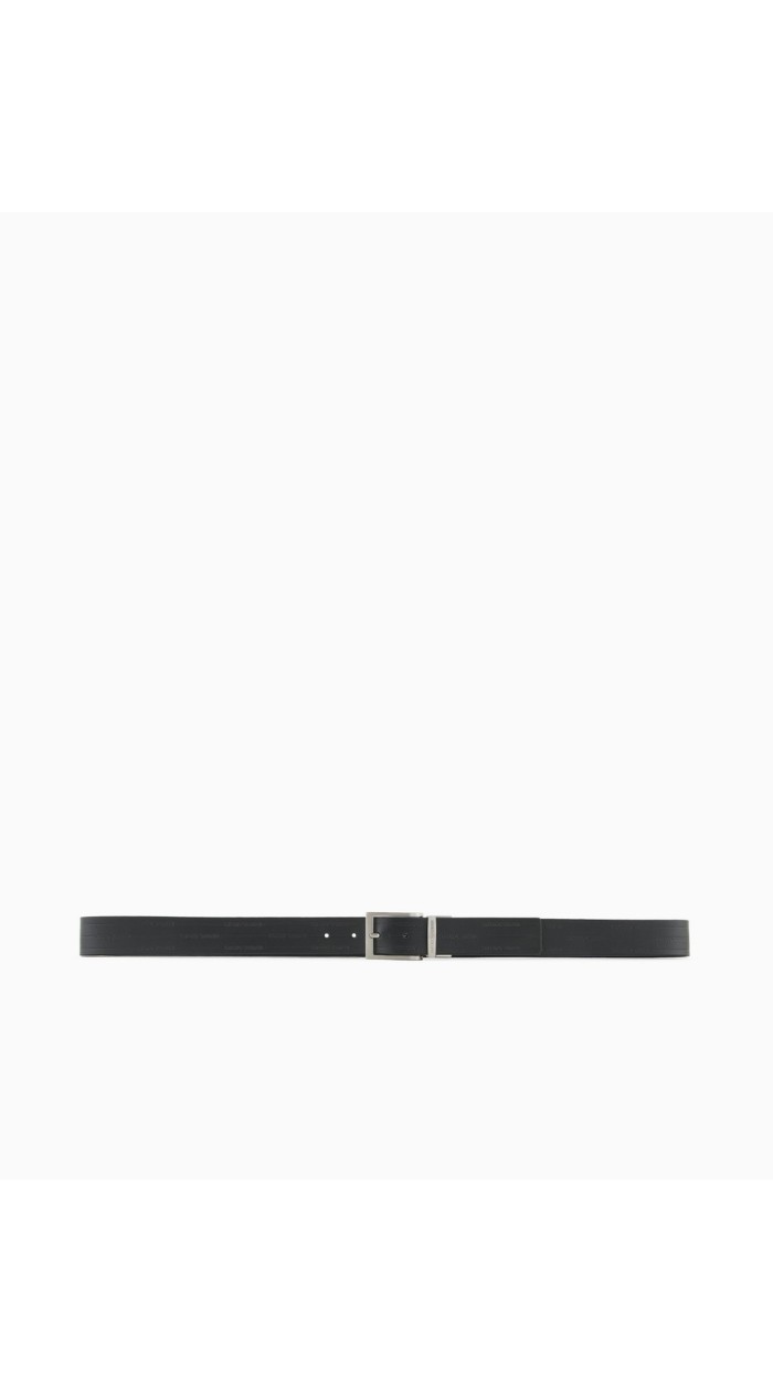 Belt made from cowhide leather and characterised by its reversibility: one side features an embossed logo that runs the entire length of the accessory for a more distinctive look, while the other side has a smooth finish in a contrasting colour that complements any outfit.