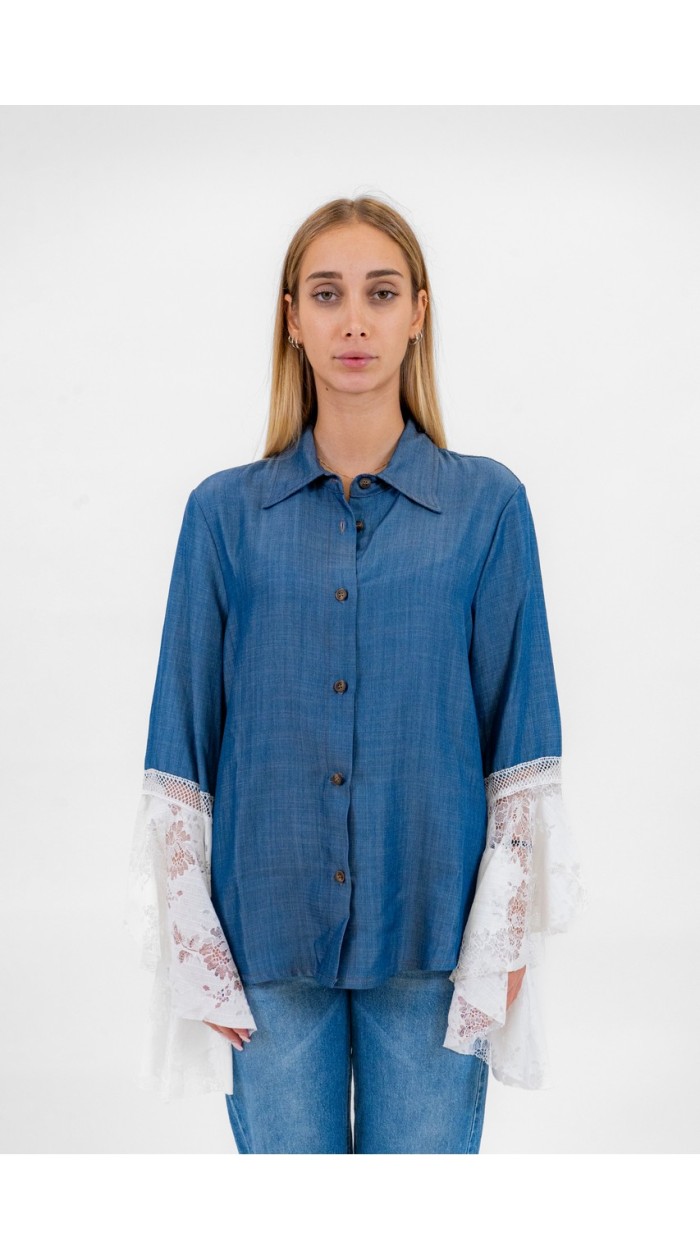 Women's long-sleeved shirt with lace detail at the hem, button closure, cropped style, oversized fit.