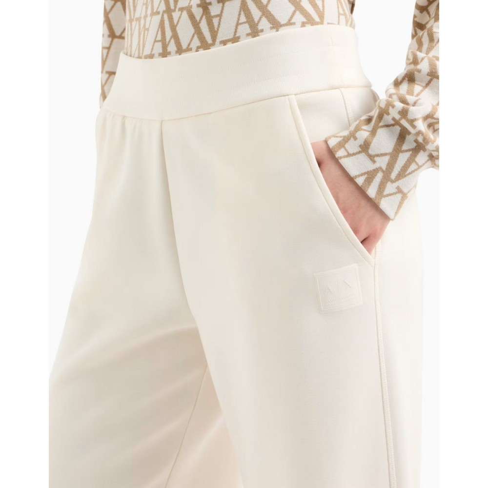 Armani Exchange women's tracksuit trousers, elasticated waist with drawstring, flush pocket, elasticated hem, logo patch on front.
