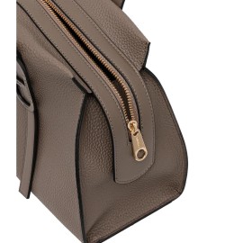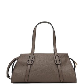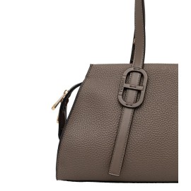 The Twinset shoulder bag with logo features a hammered texture, two handles, logo detail, top zip closure, and shoulder strap. The composition is 100% fabric.