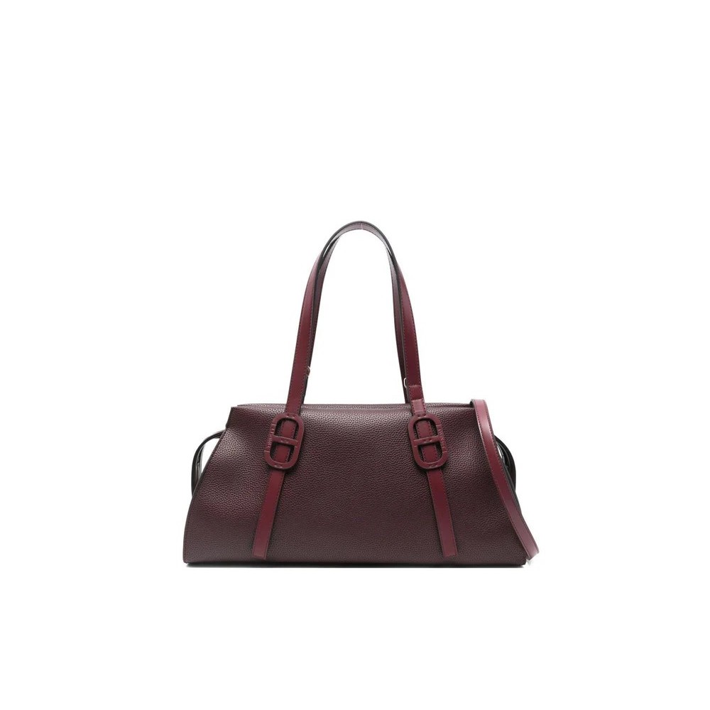 The Twinset logo shoulder bag features a hammered texture, two handles, logo detail, top zip closure, and shoulder strap. The composition is 100% fabric.