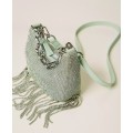 Mini Croissant bag in rhinestone knit, constructed with chains of matching rhinestones that create a fringe effect at the bottom.