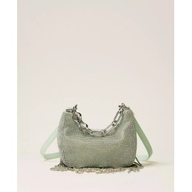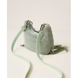 'Mini Croissant' bag in rhinestone knit with matching rhinestone chains that create a fringe effect at the bottom. It has a rhinestone closure, a chain handle that can be opened with a new custom logo snap hook, a removable cross-body strap, and is lined.