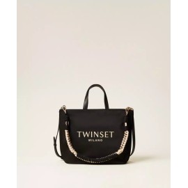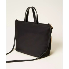 Shopper bag in structured technical fabric with calfskin-effect trim. It has a magnetic closure, braided rope shoulder strap, double hand strap, and removable crossbody strap. It is personalized with a thick printed lettering logo.