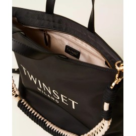 Shopper bag in structured technical fabric with calfskin-effect trim. It has a magnetic closure, braided rope shoulder strap, double hand strap, and removable crossbody strap.