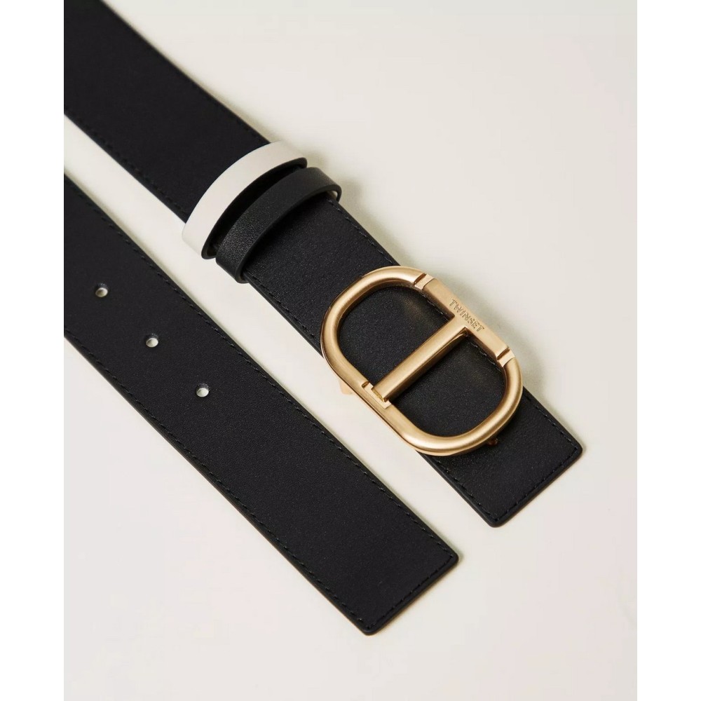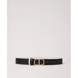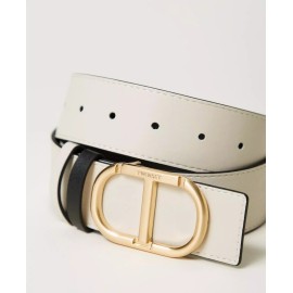 Reversible low-waisted leather belt with removable gold electroplated Oval T buckle, two-tone belt loops.