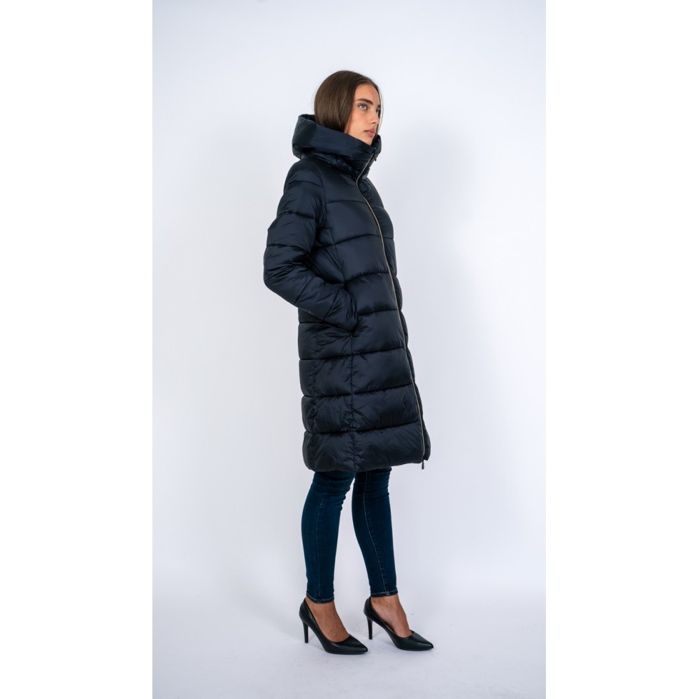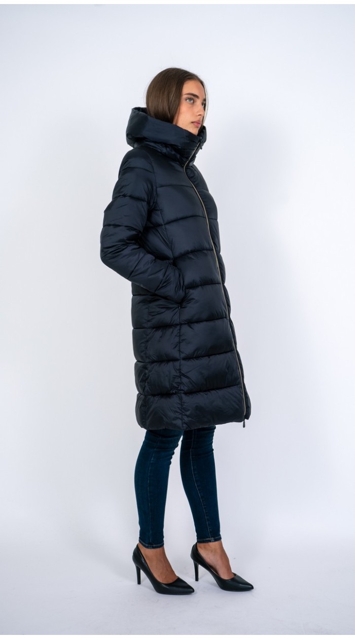 Made from shiny nylon, the Lydia women's long down jacket stands out for its voluminous collar and A-line silhouette, quilted with a horizontal pattern.