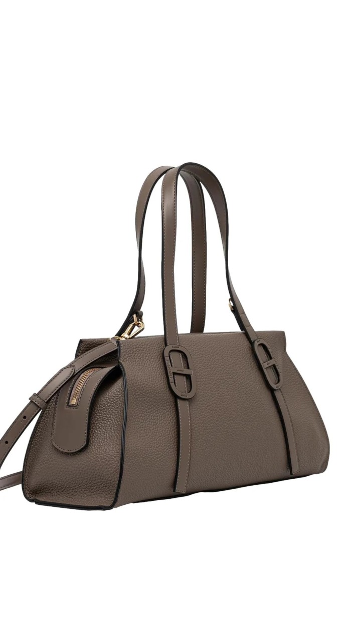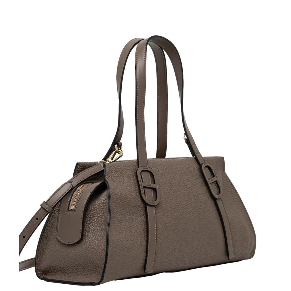 The Twinset shoulder bag with logo features a hammered texture, two handles, logo detail, top zip closure, and shoulder strap. The composition is 100% fabric.