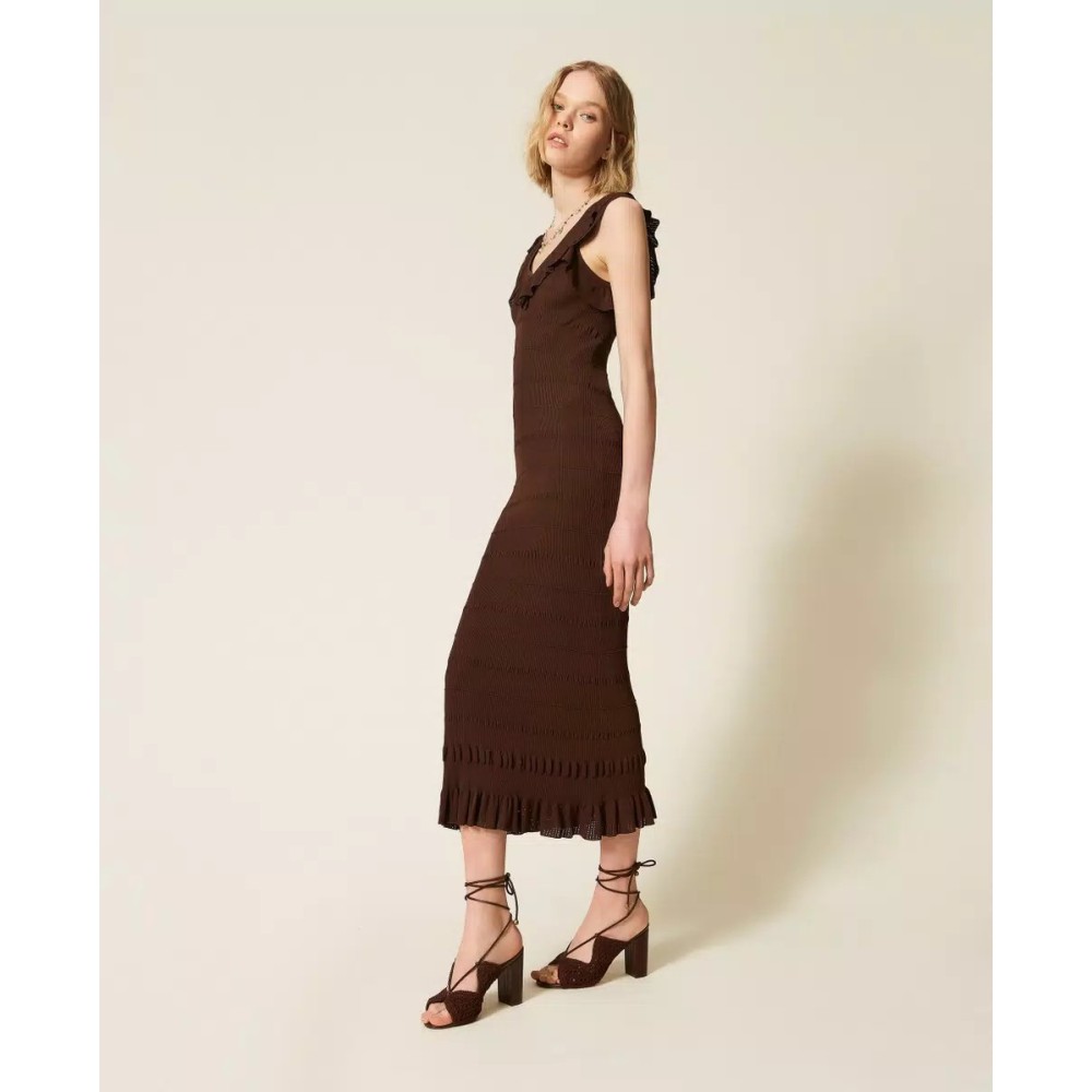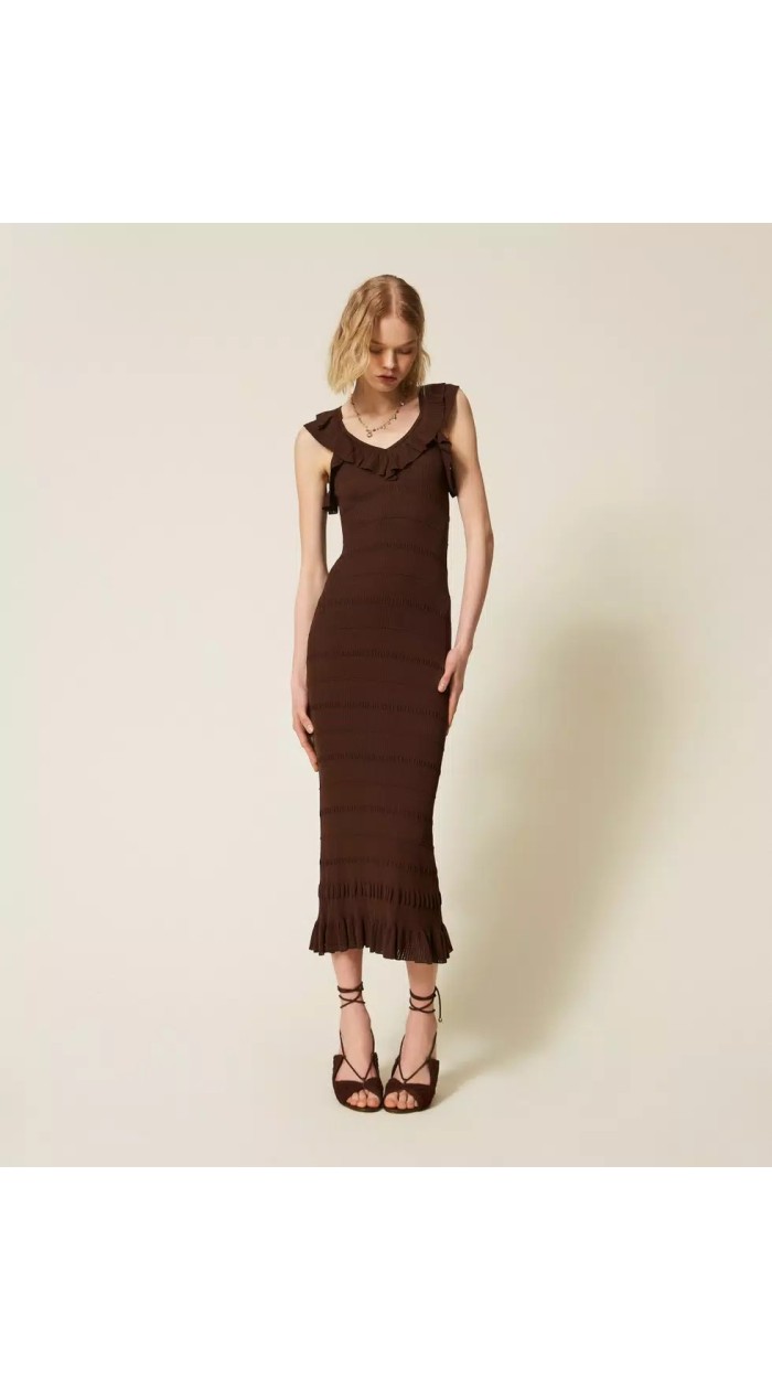 A midi dress made of stretch viscose with a ribbed pattern interspersed with horizontal embossed details. It features a V-neckline and armholes finished with perforated ruffles, and a fitted silhouette.
