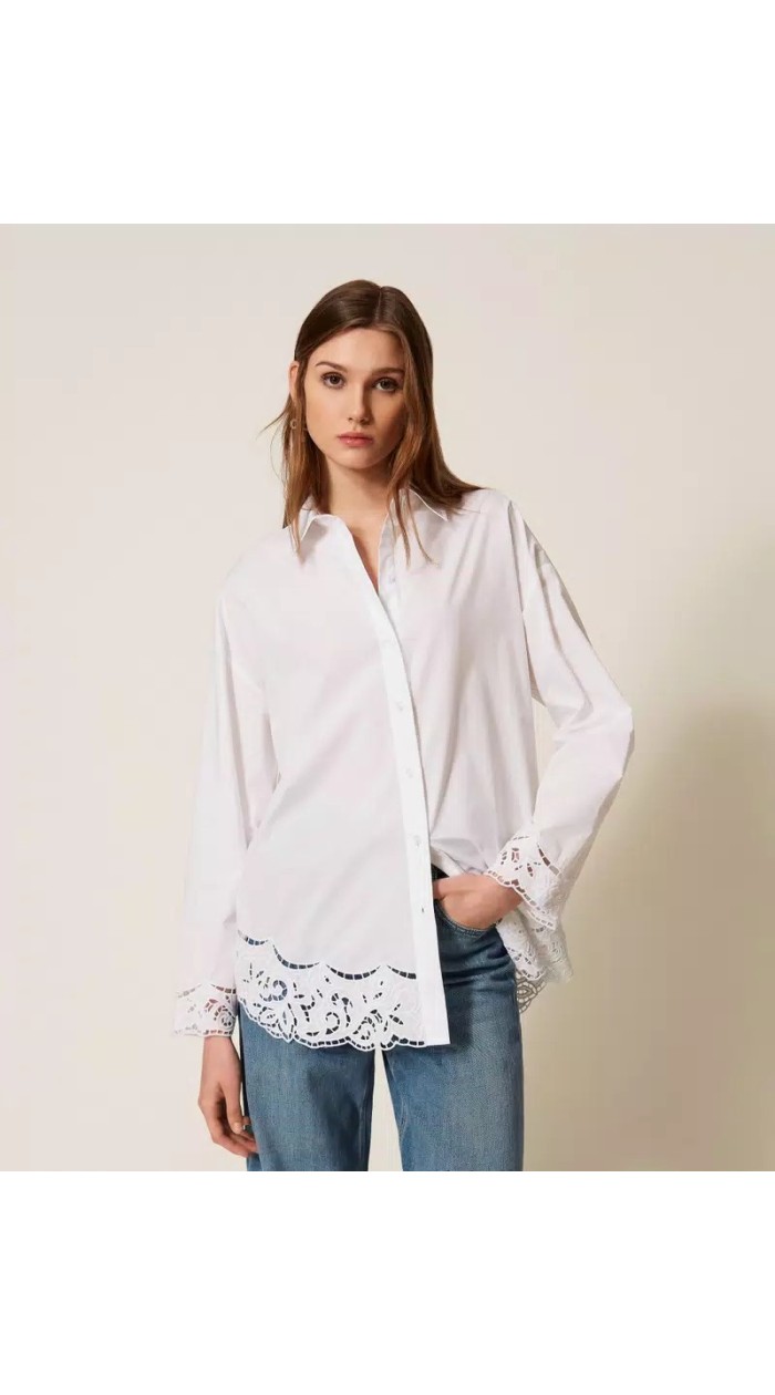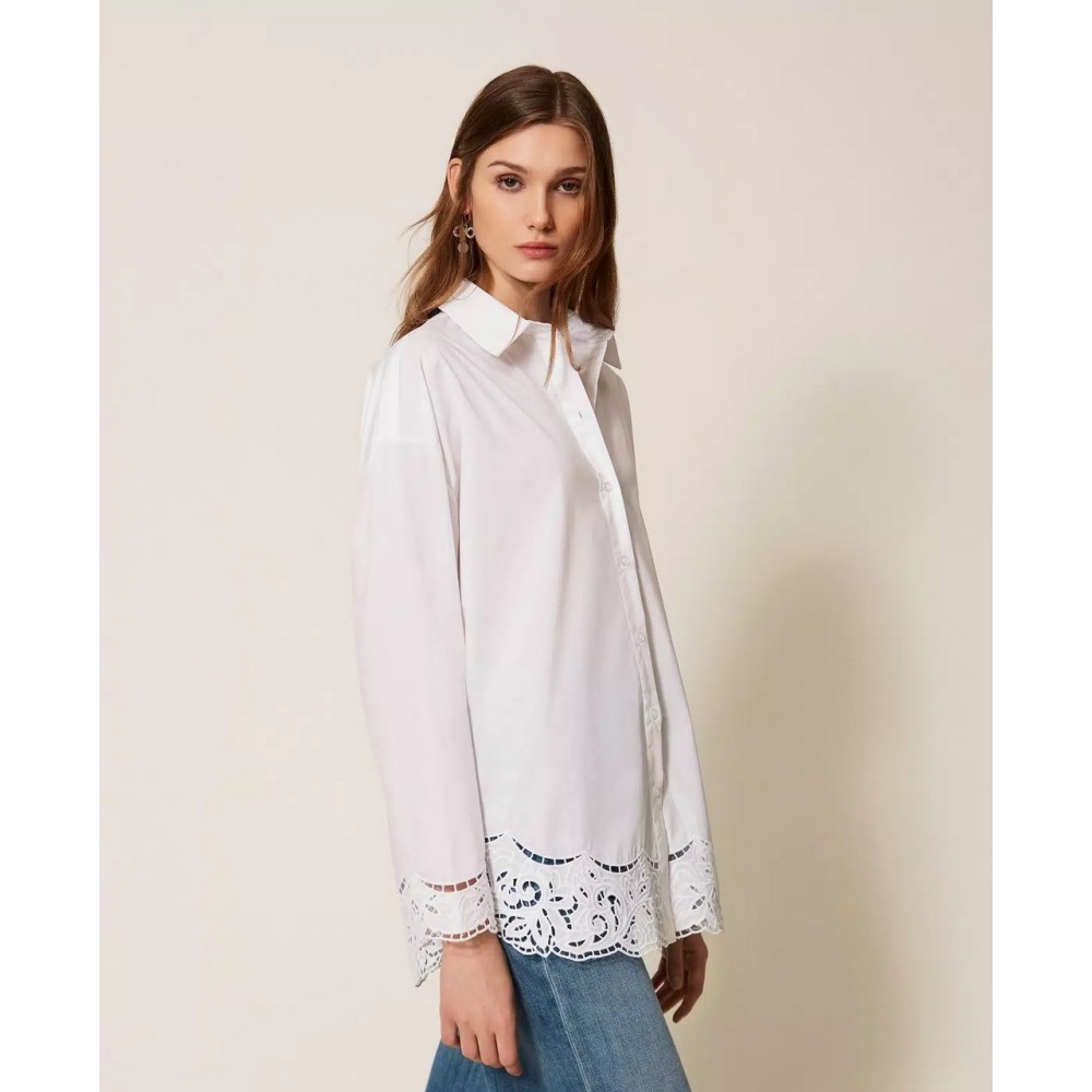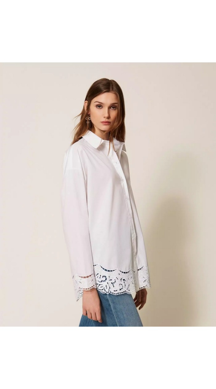 Cotton poplin shirt featuring intarsia embroidery along the hem. It has a button-down closure, long sleeves with buttoned cuffs, and a loose fit.