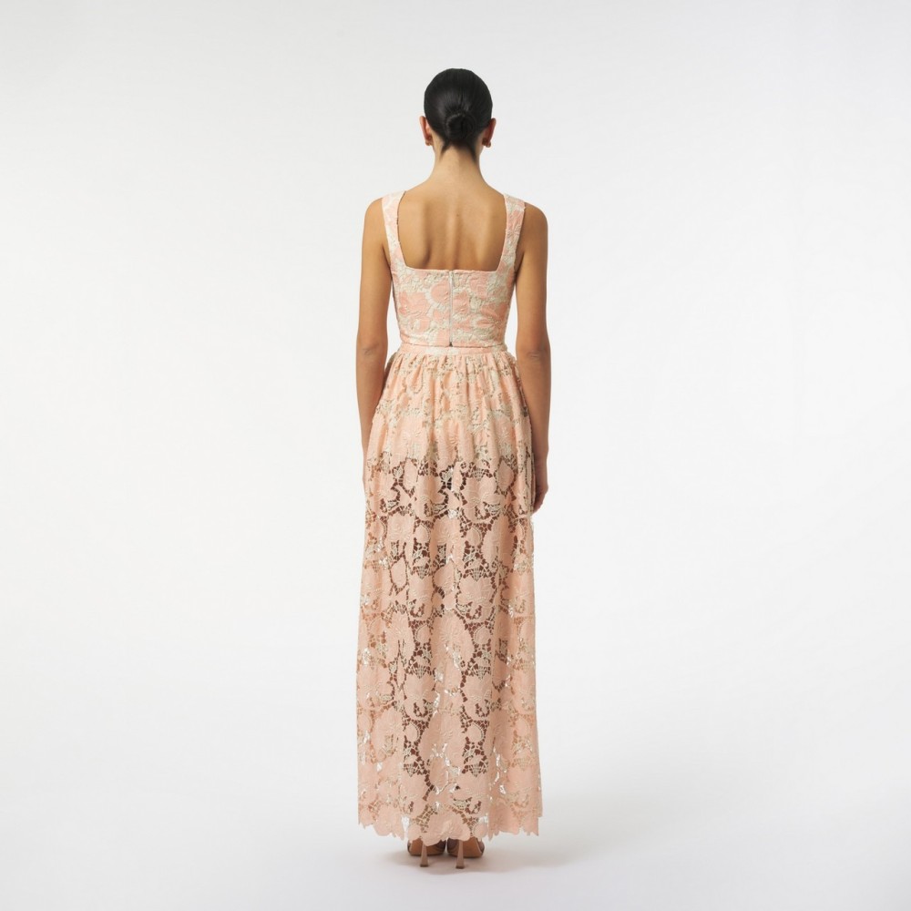 A long, flowing macramé skirt with a romantic and sophisticated charm, crafted from exquisite lace featuring a large floral pattern that creates an elegant interplay of sheer and opaque sections.