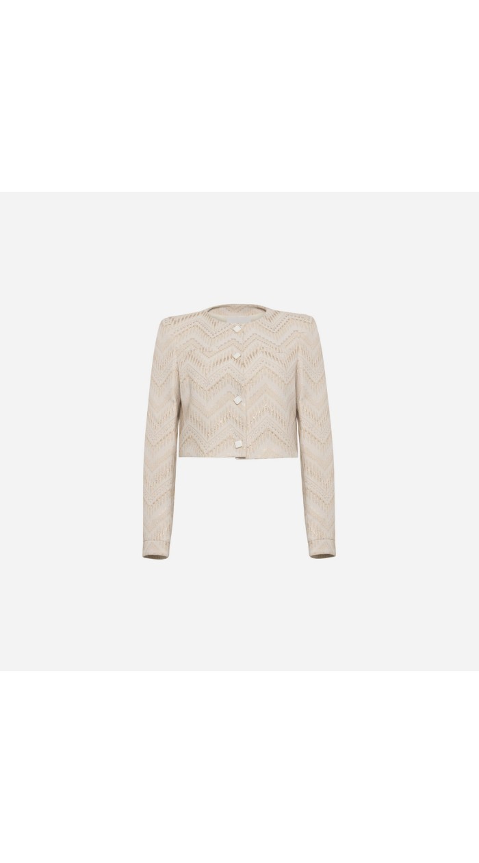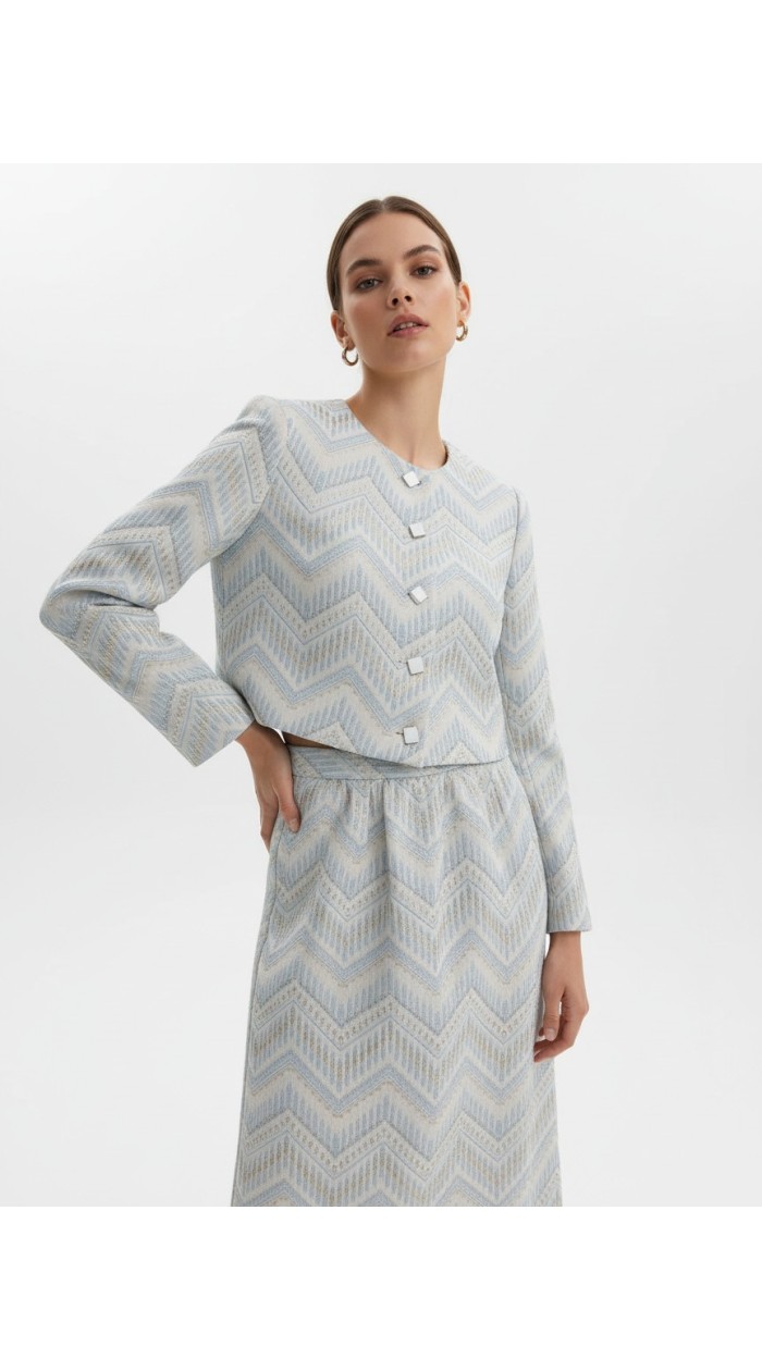 A crop blazer with a bold and sophisticated character, made from a jacquard fabric with an ethnic weave that evokes artisanal influences and exotic atmospheres.