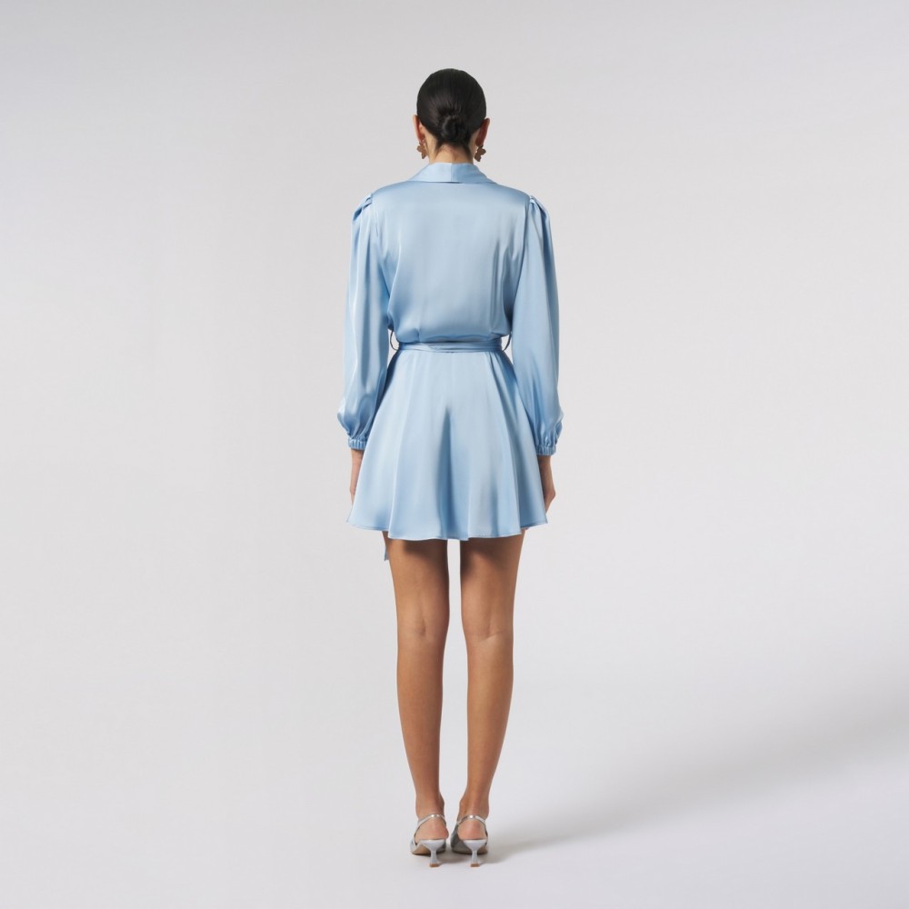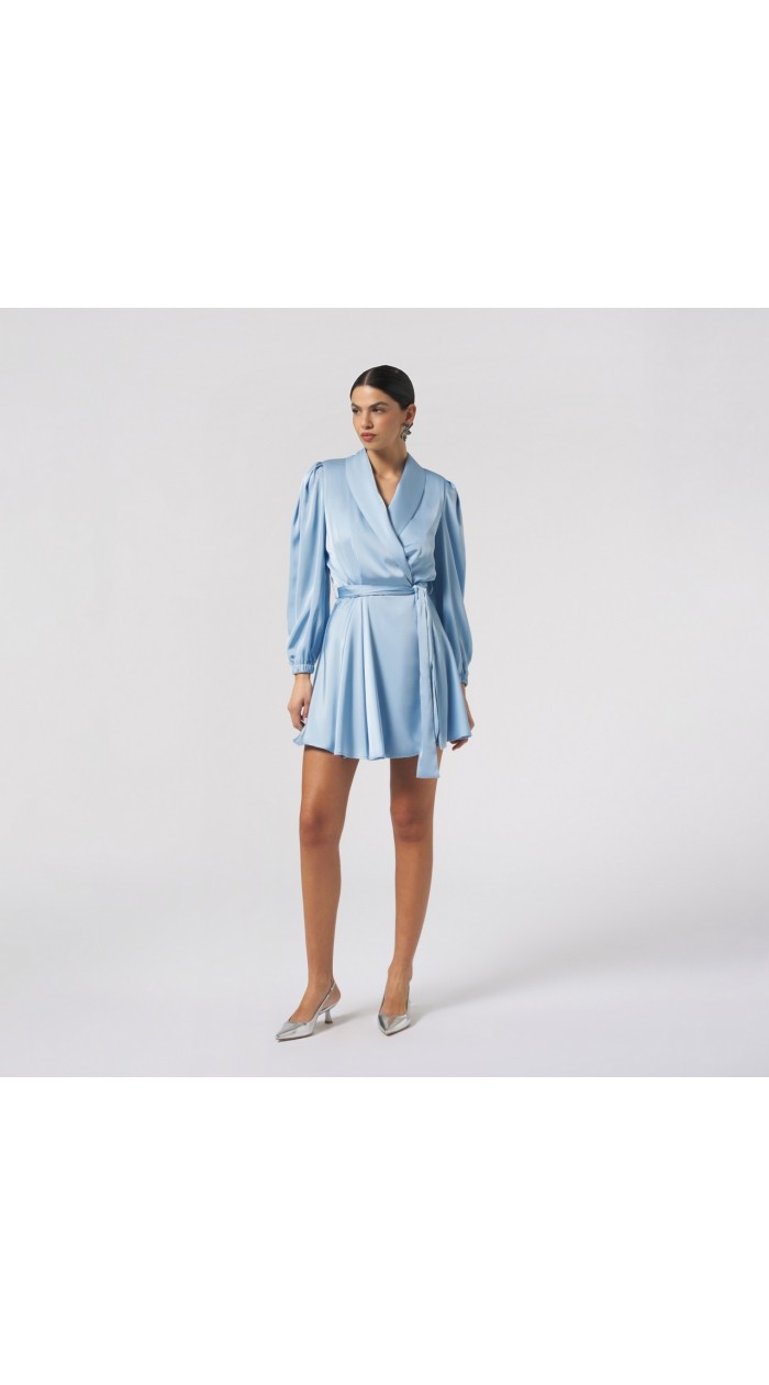 A short dress in a refined sky-blue shade, crafted from a flowing satin fabric with a soft, lustrous finish. It features a wide shawl-style lapel that frames the décolleté, creating a deep, elegant neckline.