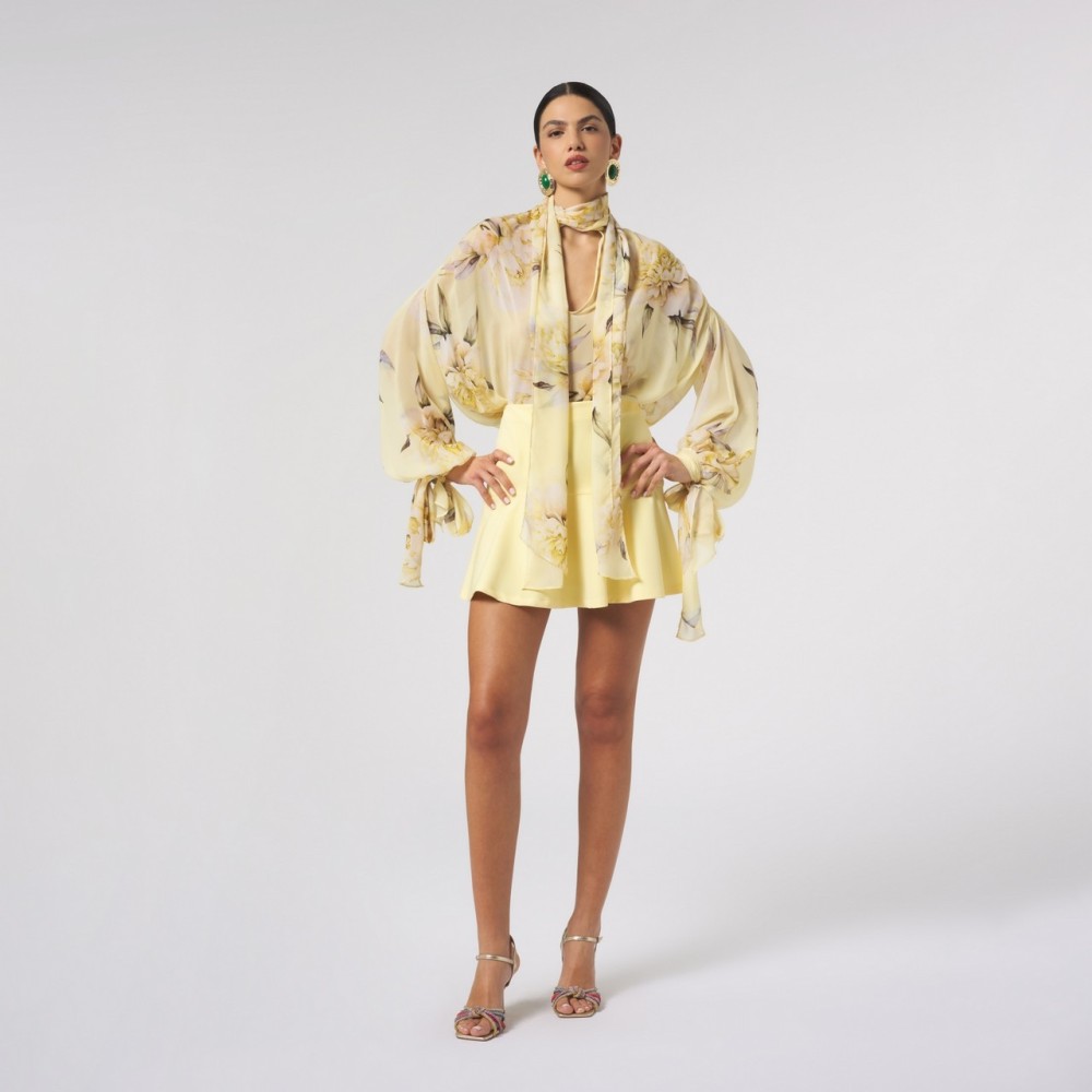 Silence Limited patterned women's skirt with a wrap-around closure and hook. The skirt can be paired with its matching jacket. The model is wearing size XS.