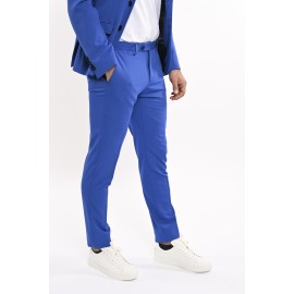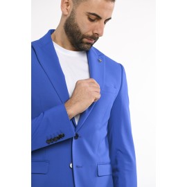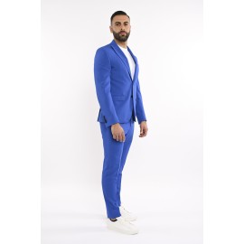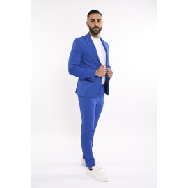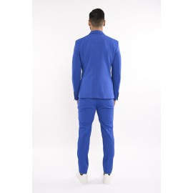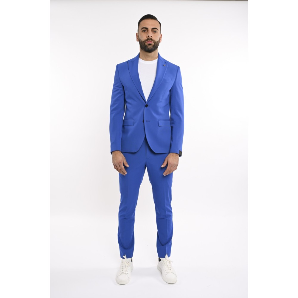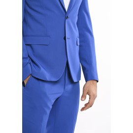 Manuel Ritz man suit drop 9 fully lined, solid colour. Jacket: two button closure, flap pocket, single breasted, slim fit. Trousers: slim fit, America pocket on front, welt pocket on back, zip, hook and button fastening. The model wears size 48.