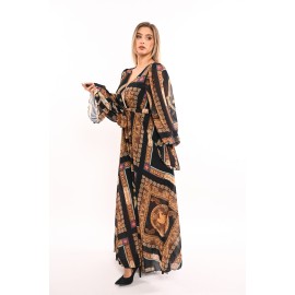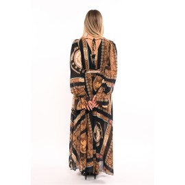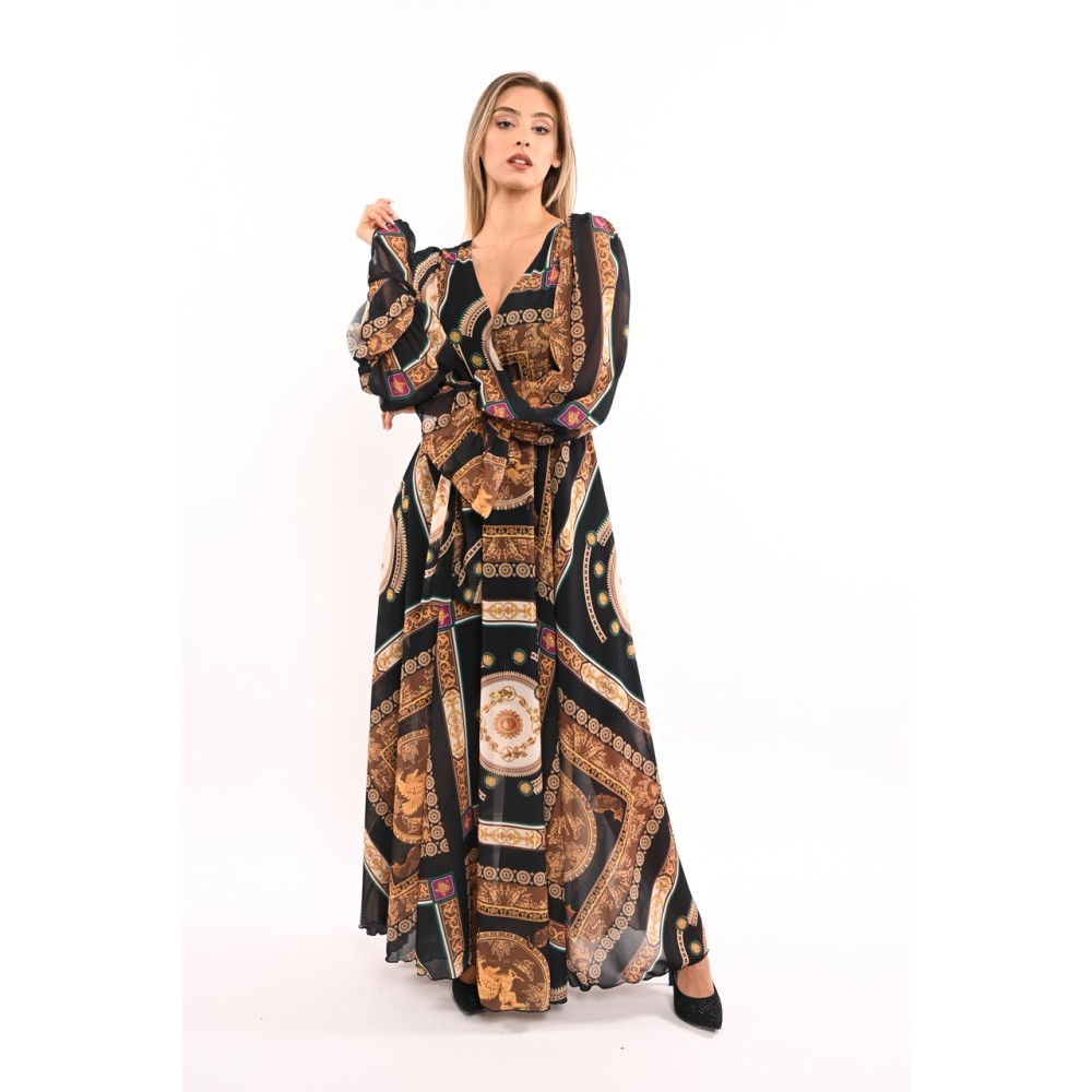 Women's long Vicolo patterned dress, V-neck, long balloon sleeve, sash waist. The model is wearing size M.