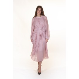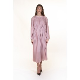 Dixie women's long pleated dress, waist sash with flower, Korean collar, back button closure, regular fit. Model is wearing size S.