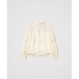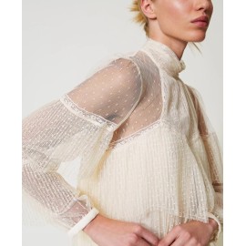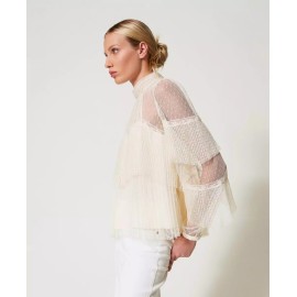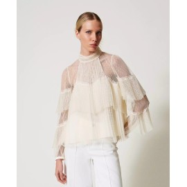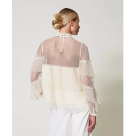 Twinset blouse in point d'esprit tulle with worked pleated flounces and lace inserts.