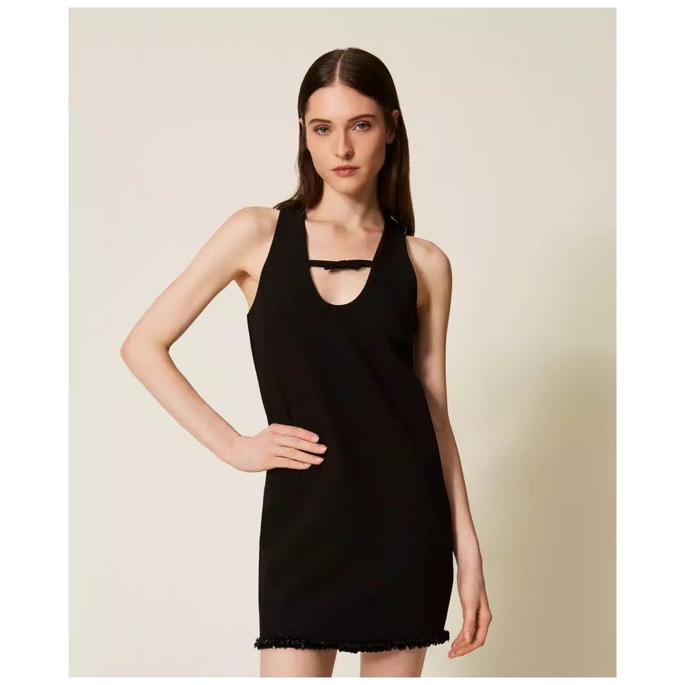 Short dress in viscose blend crepe with sequin trim at the hem. Sleeveless, with ribbon and bow neckline, invisible zip closure, lining, Oval T logo tag on the back, slim fit.