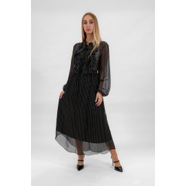 Dixie long polka dot dress, shirt dress style, button closure and ruffle on the chest, long sleeves, elastic waist, slim fit.